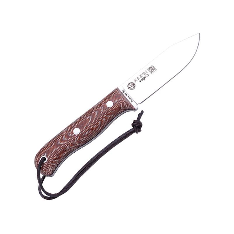 Caratteristiche : • Acciaio : Molibdeno Vanadio • Lunghezza lama (mm) : 105 • Lunghezza totale (mm) : 225 • Impugnatura (Finitura) : Micarta • Colore lama : Bianca • Profilo della lama : Drop point • Affilatura : Liscia • Apertura Sicurezza : Fissa con mezza guardia • Port : Fodero in pelle
