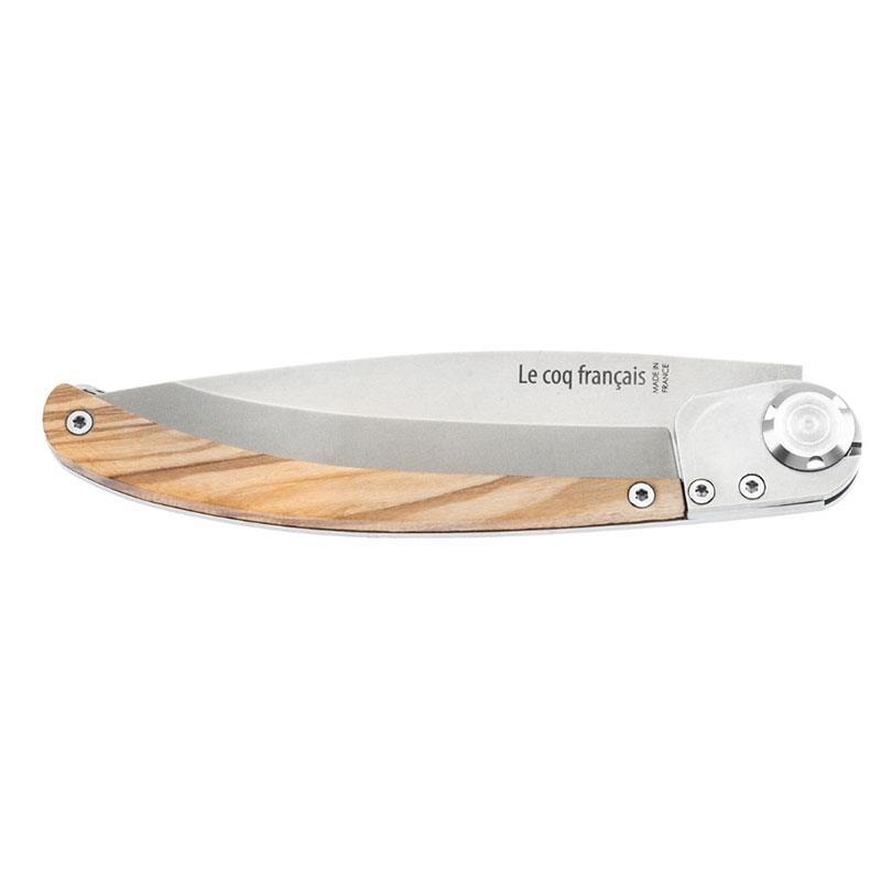La lama pieghevole retrattile all'interno dell'impugnatura dei coltelli Le Coq Français è in acciaio inox Z40C13. L'impugnatura in inox e la lama hanno una finitura satinata. Levigato manualmente con cera d'api, il legno di ulivo è utilizzato per l'impugnatura del coltello modello “Chêne”. Potrete apprezzare la magnifica incisione laser nera presente sul recto/verso dell'impugnatura del vostro coltello. Tutti i pezzi di ricambio (lama, platina, impugnatura inox e legno) sono di fabbricazione 100 % francese e completamente lavorati a Thiers, capitale della coltelleria. L'assemblaggio e l'affilatura dei coltelli Le Coq Français sono anch'essi realizzati manualmente in Francia, a Thiers.