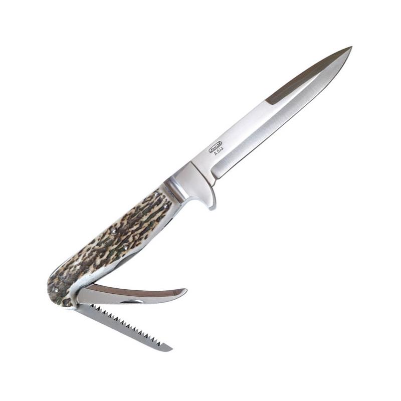 Caratteristiche : • Acciaio : 440A • Lunghezza lama (mm) : 130 • Lunghezza totale (mm) : 215 • Manico (Finitura) : Corno di cervo • Colore lama : Bianca • Profilo della lama : Drop point • Colore manico : Legno naturale • Affilatura : Liscia • Apertura Sicurezza : Fissa con mezza guardia • Trasporto : Fodero in pelle • 3 pezzi : lama fissa, sega, lama per eviscerare.
