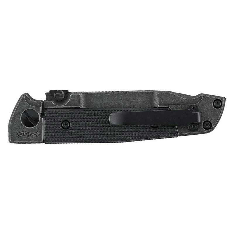 Coltello pieghevole tattico di alta gamma con chiusura framelock in acciaio (pulsante ambidestro) Design ispirato a quello della pistola di successo Walther Q5 match Steel Frame Lama spearpoint con filo combinato, realizzata in resistente acciaio D2 Lama e manico in acciaio inossidabile con finitura Blackwash Impugnatura con inserto in FRN monoblocco con motivo superficiale originale Q5 Ottima presa in mano, grazie alla dettagliata zigrinatura