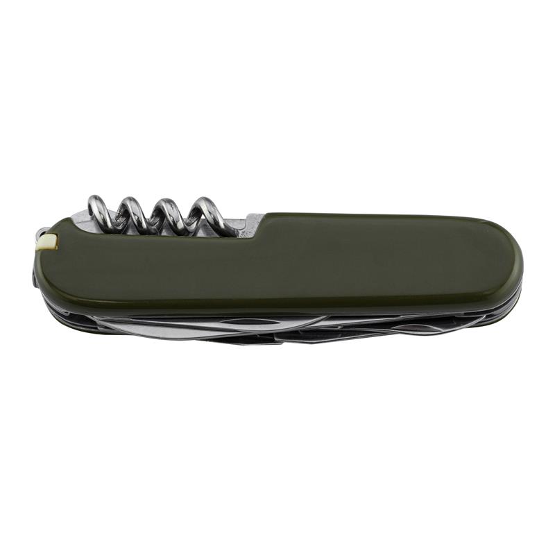 • Lama principale 6,7 cm - Spessore 2,65 mm • Piccola lama • Apriscatole • Piccolo cacciavite a taglio • Grande cacciavite a taglio • Pinzetta • Stuzzicadenti • Paio di forbici • Apribottiglie • Uncino • Punteruolo • Cavatappi • Anello diviso