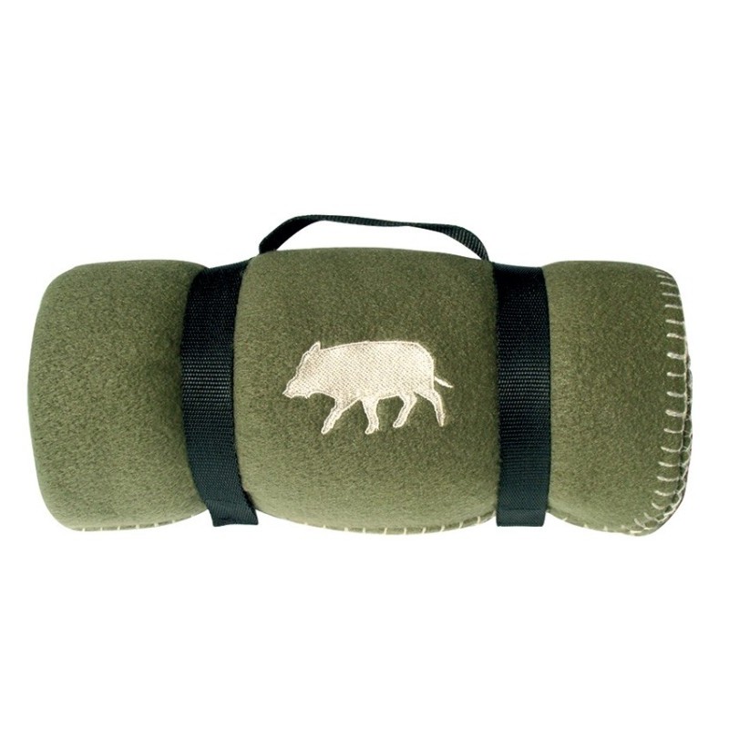 questo plaid in pile, ricamato con l'effigie del cinghiale è il compagno indispensabile delle battute di caccia invernali. si rivelerà particolarmente utile per affrontare il freddo quando sarete appostati. compatto, si arrotola e si ripone facilmente grazie al suo sistema di fissaggio, può restare nel vostro veicolo. dimensioni : 120cm x 150cm.