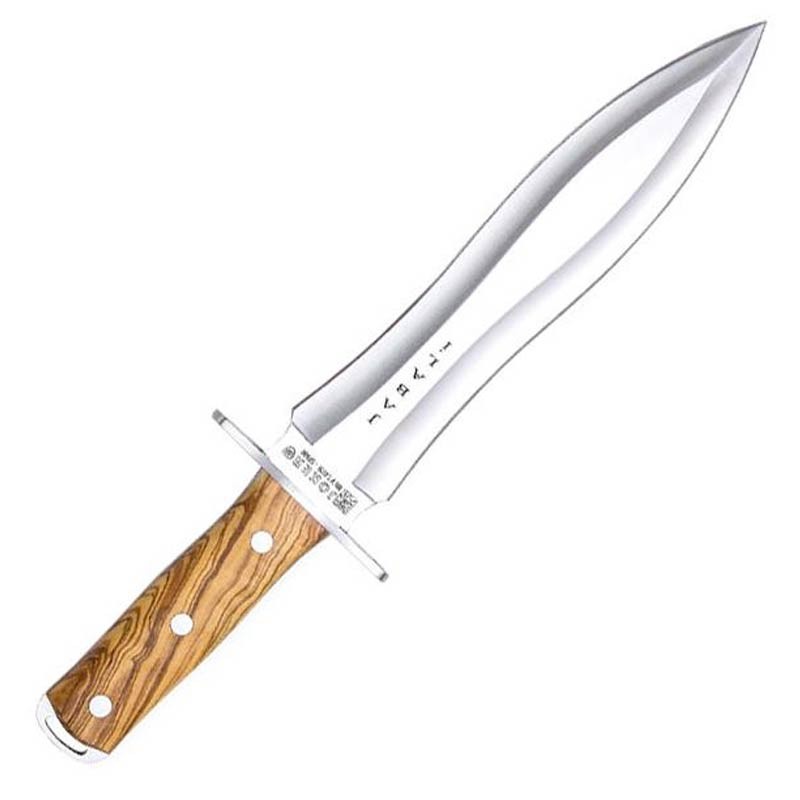 Caratteristiche : • Acciaio : Molibdeno Vanadio • Affilatura : Liscia • Profilo della lama : Pugnale • Trasporto : Fodero in pelle • Lunghezza totale (mm) : 410 • Lunghezza lama (mm) : 250 • Manico (Finitura) : Ulivo • Colore manico : Legno naturale • Colore lama : Bianca • Apertura di sicurezza : Fissa con doppia guardia • Spessore della lama : 5mm. • A pieno codolo.