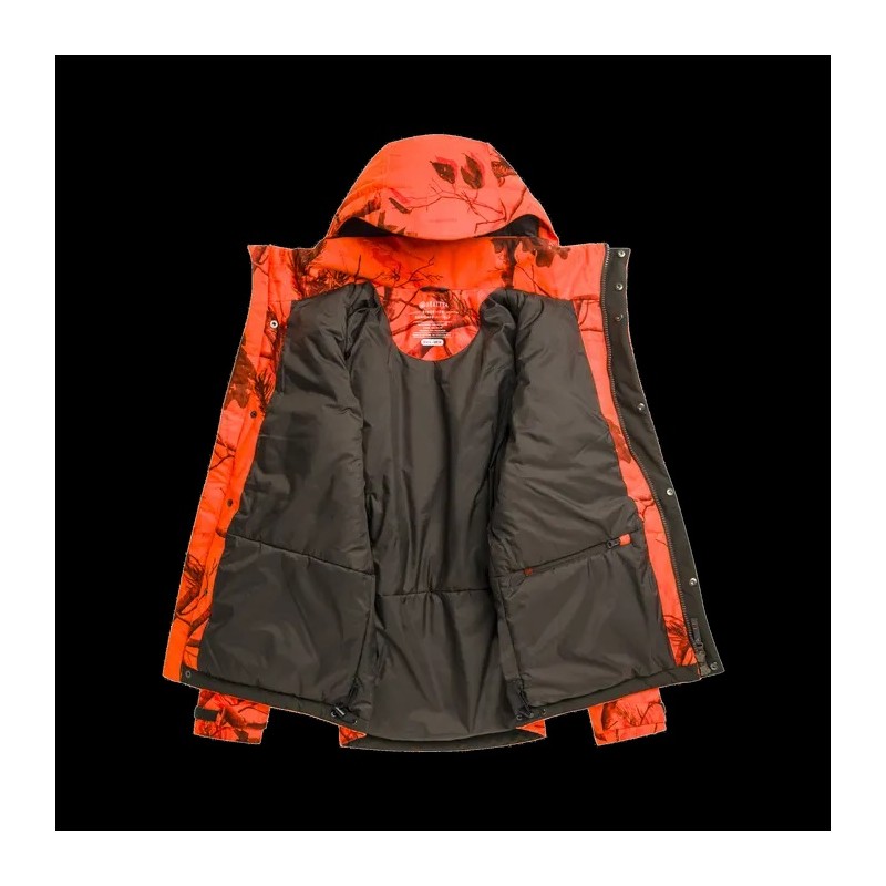Giacca da caccia per uomo Mull Insulated, progettata per la caccia da capanno o la caccia all'agguato in luoghi aperti, dove è indispensabile essere completamente silenziosi e asciutti. È impermeabile, silenziosa, termica e traspirante. Impermeabile e traspirante grazie alla membrana BWB EVO - Beretta Waterproof Breathable EVO. Resistente al freddo grazie all'imbottitura sintetica da 180 g applicata sul corpo e da 160 g sulle maniche. Il tessuto esterno è un poliestere goffrato silenzioso ed elastico, sottoposto a trattamento idrorepellente DWR - Durable Water Repellent. La giacca è disponibile nella versione camo orange Realtree AP® Hd con alta visibilità certificata EN 17353: 2020. La giacca può essere abbinata al pantalone Mull Insulated.