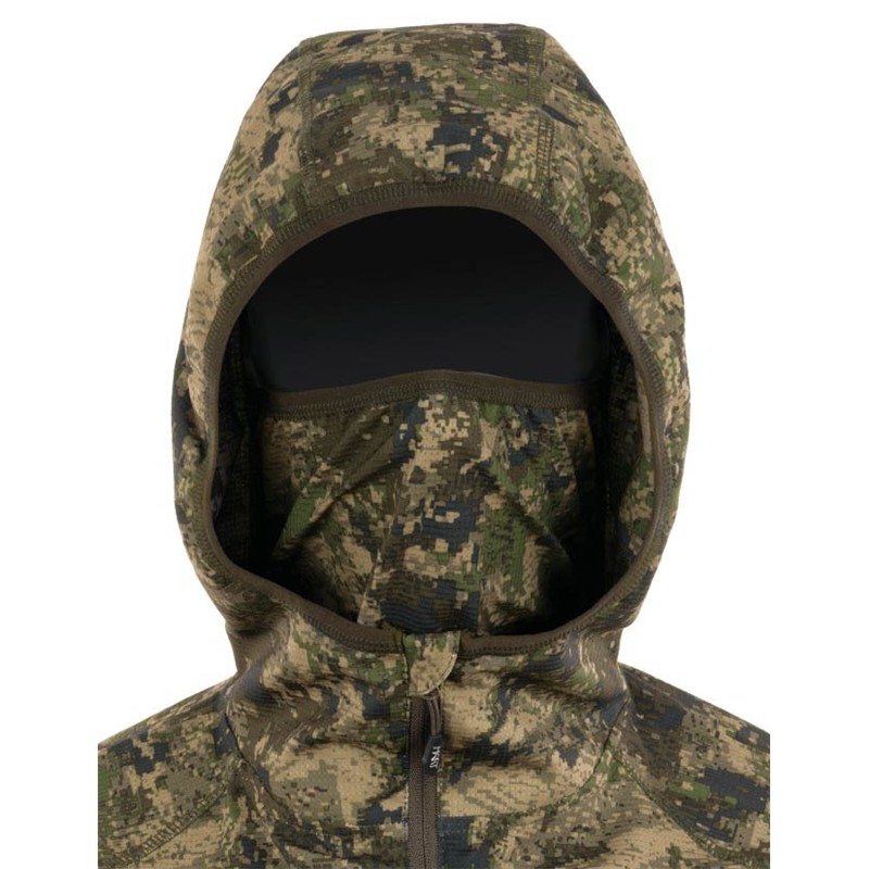 Felpa con cappuccio altamente adattabile, può essere utilizzata come strato esterno o intermedio, progettata per offrire maggiore comfort e mimetizzazione in condizioni di elevata umidità e temperature elevate, sia per la caccia attiva che per la caccia stazionaria.