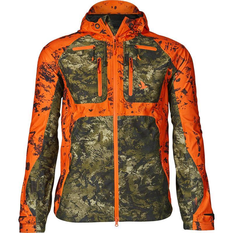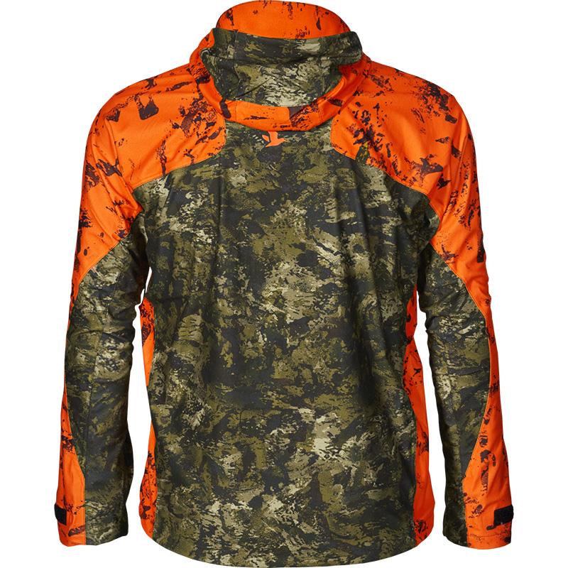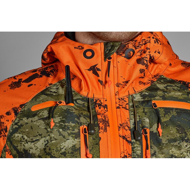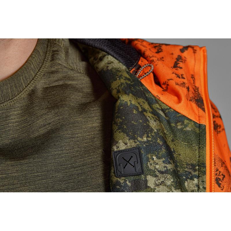 La giacca Vantage è realizzata in jersey spazzolato silenzioso, unendo i motivi mimetici InVis green e InVis orange blaze.