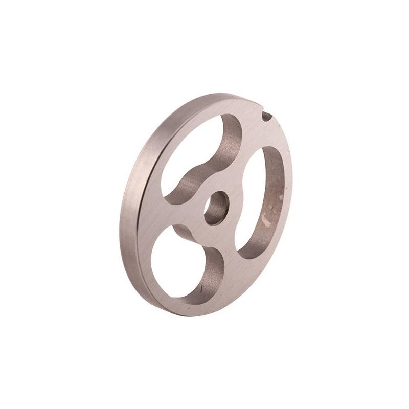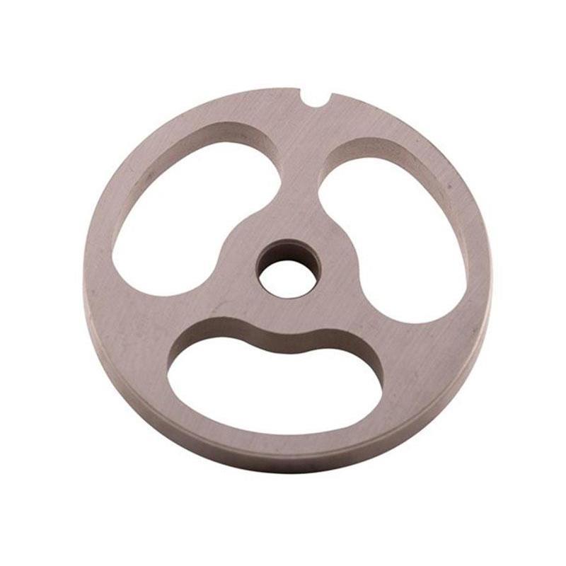 Griglia acciaio 3 fori per far passare cipolle e grasso, per tritacarne elettrico n° 12. Piastra perforata a 3 fori con incavo di mantenimento per tritacarne n°12. I 3 fori vi permettono di far passare il vostro grasso per le vostre preparazioni, potete anche farci passare le cipolle. Questa griglia è in acciaio, il che le conferisce un taglio netto. Dopo averla utilizzata, pulire la griglia e asciugarla immediatamente prima di conservarla in carta unta o in carta assorbente imbevuta di grasso.