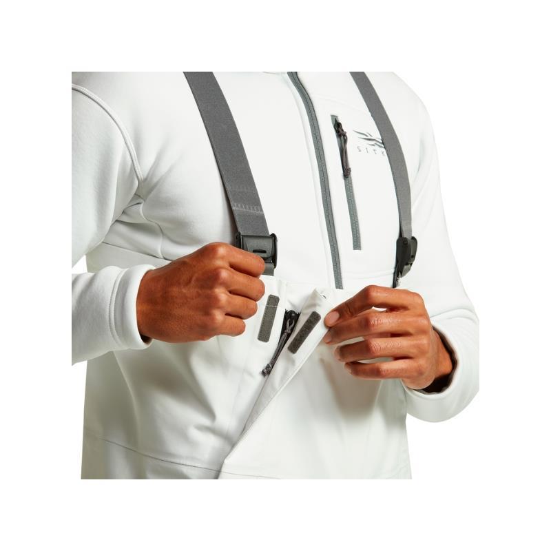 L'equipaggiamento non dovrebbe finire nelle discariche, quindi abbiamo progettato una bavetta durevole che non lo farà. Poiché il fango è la principale causa di guasto delle cerniere, le cerniere laterali di ventilazione della bavetta hanno pattine di protezione e terminano a livello del ginocchio, dove vengono sostituite da bottoni a pressione fino ai polsi. Abbiamo inoltre collaborato con Gore per creare un tessuto impermeabile/traspirante che imita il colore e il profilo di riflessione UV delle piume d'oca delle nevi in modo che non siate percepiti come una minaccia sul terreno. I bianchi più confortevoli che possiate acquistare, dispongono di una sospensione anteriore regolabile senza fibbia che permette una regolazione senza interferire con l'imbracciamento del vostro fucile da caccia.