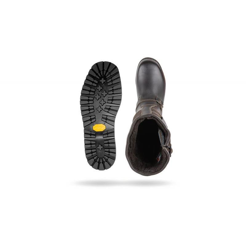 Caratteristiche : • Tomaia : In pelle e pellame impermeabile e idrorepellente • Fodera : Gore-Tex Insulated Comfort Footwear Lining e agnello. • Colletto : Fibbia sul gambale e cinturino in pelle. • Chiusura : Zip sul lato esterno per facilitare la calzata. • Sottopiede : A struttura differenziata. • Soletta interna removibile : Cambrelle + Carbone attivo + Feltro. Essa facilita lo sforzo sull'arco plantare longitudinale, sul tallone e sul metatarso. Disegno speciale CRISPI antiscivolo e feltro in carbone attivo con proprietà antibatteriche. • Suola : Vibram con inserto ammortizzante in gomma. • Costruzione della Suola : Cucitura norvegese.
