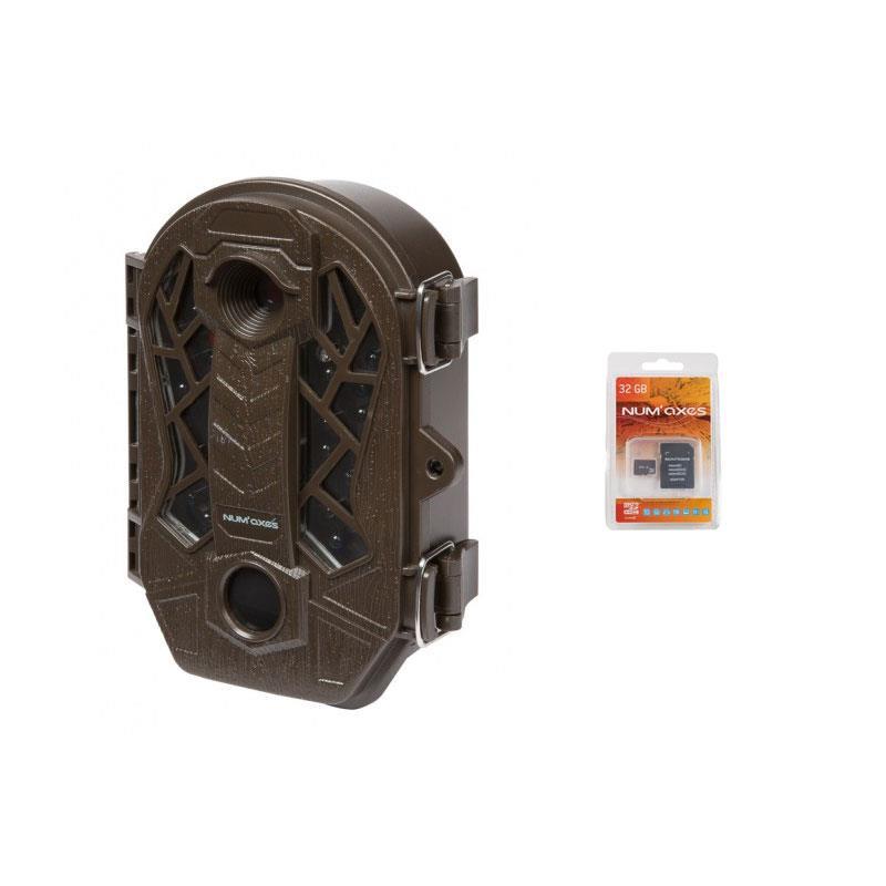 Caratteristiche della fototrappola PIE1035 • Sensore PIR (rilevatore di movimento) : • Ampio angolo di rilevamento : 90° • Distanza di rilevamento : fino a circa 18 m • Sensibilità regolabile : alta / media / bassa • Flash a infrarossi : • Portata : fino a circa 18 m • 24 LED invisibili (lunghezza d'onda : 940 nm) • Attivazione automatica in base alla luminosità • Campo visivo : 55° • Modalità di acquisizione : • Foto : da 1 a 3 foto per scatto • Video : durata programmabile (da 10 secondi a 5 minuti) • Foto + Video : l'apparecchio scatta prima una foto e poi registra un video • Risoluzione foto : 3 MP / 5 MP / 8 MP / 12 MP / 16 MP • Formato dei file foto : JPEG • Risoluzione video : VGA / HD 720P / FULL HD 1080P • Formato dei file video : AVI • Modalità rilevamento PIR : l’apparecchio scatta foto o registra video quando il sensore PIR (rilevatore di movimento) rileva attività nell'area che copre • Modalità Time Lapse : foto o video vengono acquisiti automaticamente a intervalli regolari durante una fascia oraria definita dall'utente • Marcatura sulle foto : ora, data, temperatura, fase lunare, numero identificativo dell'apparecchio (se l'utente ne ha programmato uno) • Memoria : scheda SD o micro SD con adattatore da 4 Go a 32 Go, classe 10 minimo (non fornita). L'apparecchio funziona anche con la scheda micro SD con adattatore da 64 Go del marchio NUM'AXES. Schede di memoria da 64 Go di altre marche potrebbero non funzionare. È possibile procurarsi schede micro SD con adattatore in qualsiasi momento su questo sito (8 Go, 16 Go, 32 Go o 64 Go). • Possibilità di assegnare un numero identificativo all'apparecchio : permette di sapere dove e con quale apparecchio è stata scattata una foto • Affidabile ed efficace • Garanzia : 2 anni • Progettato per resistere alle intemperie (IP54) • Tempo di scatto : 0,8 secondi • Ergonomia della fototrappola PIE1035 • Dimensioni : 150 x 112 x 66 mm • Peso : 265 g (senza batterie) • Alimentazione : 8 batterie AA alcaline o 8 batterie ricaricabili AA Ni-MH (non fornite) - È possibile procurarsi queste batterie in qualsiasi momento sul presente sito internet. • Schermo LCD monocromatico per effettuare le impostazioni (1.3') • Possibilità di aggiungere un'alimentazione esterna (non fornita) : • Ingresso AC 100 V - 240 V | 50-60 HZ • Uscita DC 6 V | 2 A • Porta USB per il download dei file foto/video (cavo USB fornito)