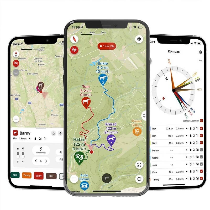 Il ricevitore può essere collegato a un telefono cellulare Android o iOS. L'app ti permette di visualizzare tutti i GPS DOG accoppiati e le loro informazioni dettagliate su una mappa. Le mappe sono disponibili online e offline.