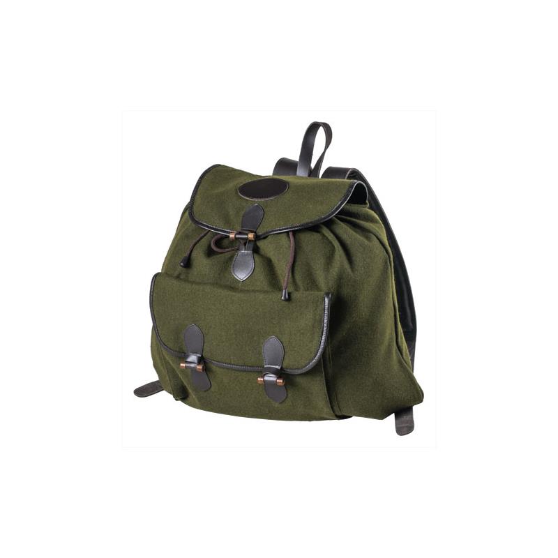 In tessuto simile al loden (82% lana, 18% nylon), fodera anti-sangue e spallacci in pelle imbottiti muniti di proteggi fibbie