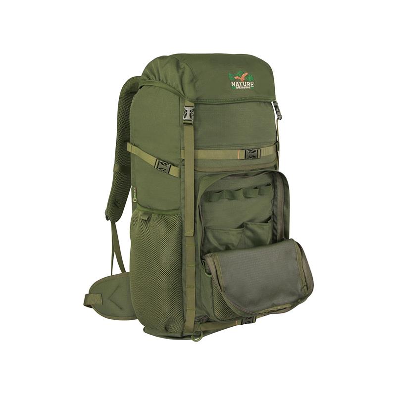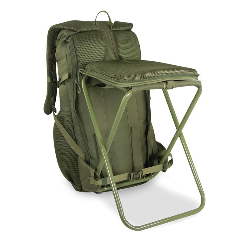 Grazie alle due cinghie interne, la seduta è rimovibile, totalmente indipendente dallo zaino. Tirando le due cinghie, la seduta assume una posizione più stabile, evitando così di richiudersi su se stessa. La tasca frontale ribaltabile è un ulteriore vantaggio, ideale per i lunghi viaggi, per trasportare comodamente e in sicurezza un'arma o una canna da pesca. Dispone inoltre di un ampio scomparto principale, di due tasche laterali per bottiglie d'acqua e di una tasca frontale per accessori. La doppia tasca sul cappuccio (una interna e una esterna) è ideale per riporre i propri effetti personali. Pannello informativo SOS stampato all'interno del cappuccio e copertura antipioggia rimovibile e impermeabile nella base.