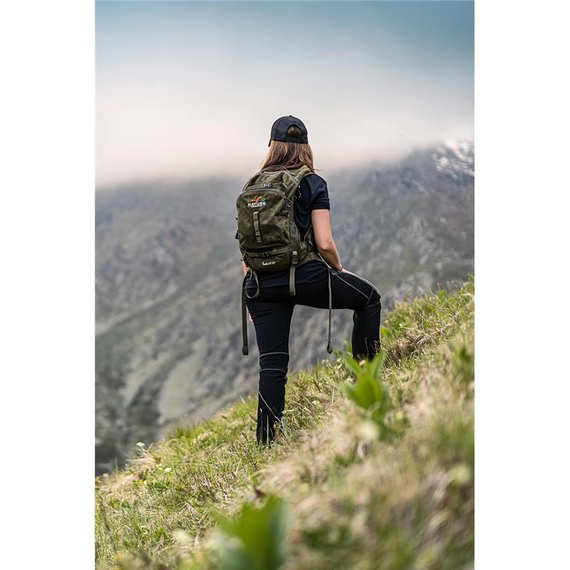 Piccolo zaino versatile e funzionale, è dotato del sistema di schienale ovale, di spallacci regolabili, di una cinghia pettorale con fischietto di emergenza e di una cintura addominale. La parte anteriore è dotata di un porta-fucile pieghevole con cinghie di regolazione, ideale per i lunghi viaggi e per trasportare la propria arma comodamente e in tutta sicurezza. Inoltre, chiudendo la tasca inferiore, lo zaino si trasforma in un vano di stoccaggio per i propri oggetti. La tasca anteriore è dotata di scomparti in rete pratici e di punti di aggancio funzionali all'esterno. Due cinghie alla base permettono di trasportare attrezzatura e tasche laterali in rete. Compatibile con un sistema di idratazione.