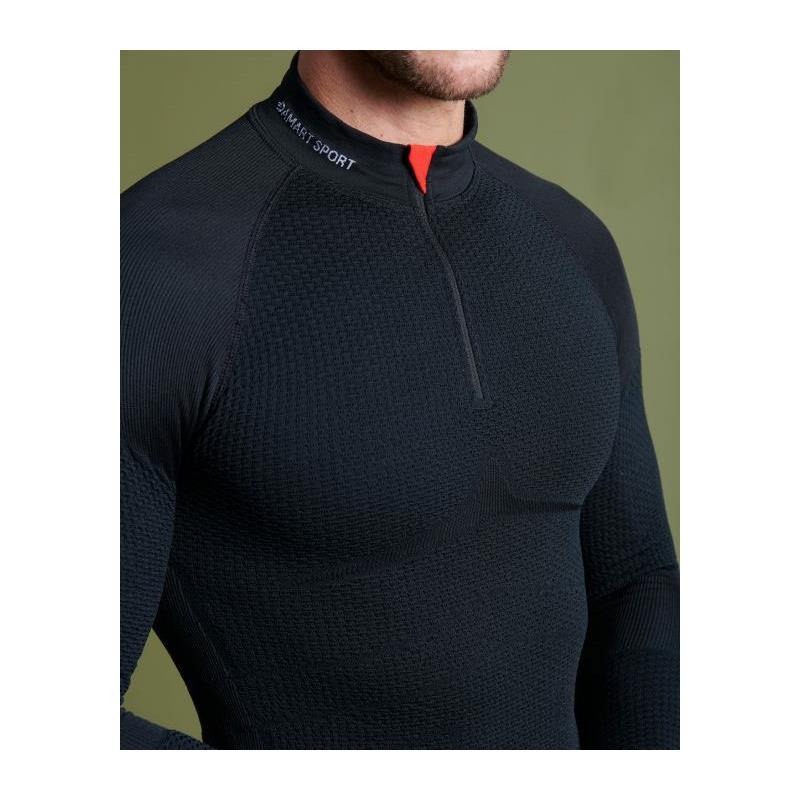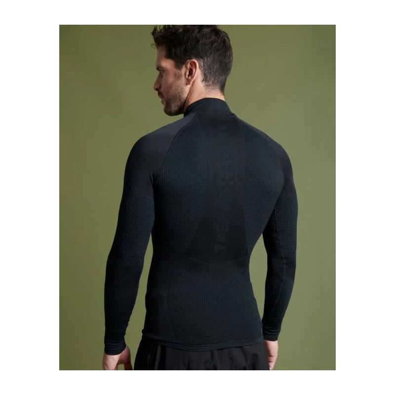 Caratteristiche : • Morbidezza di un interno spazzolato al tatto pelle di pesca. • Vestibilità comoda con cuciture piatte. • Collo alto con zip e proteggi-mento • Lunghezza della T-shirt uomo 72 cm circa. • Peso : 217,7 g. • Realizzato al 50% in poliestere riciclato.