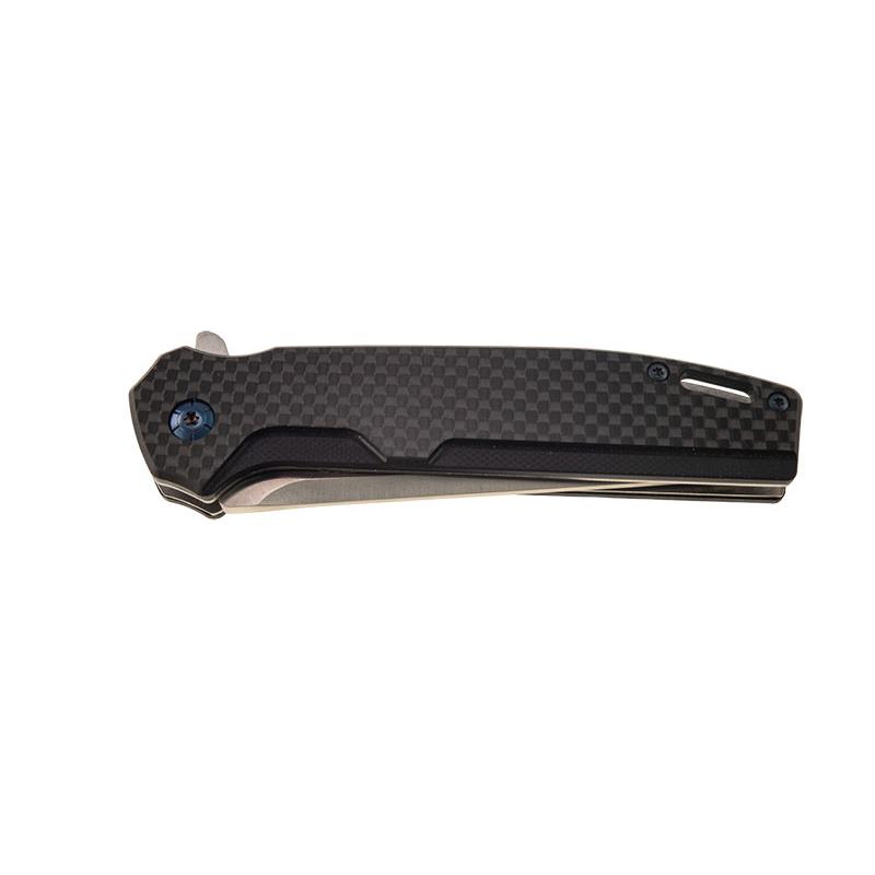 Het heft van deze messen bestaat uit een kern van roestvrij staal en schalen van koolstofvezel en G10-hars.