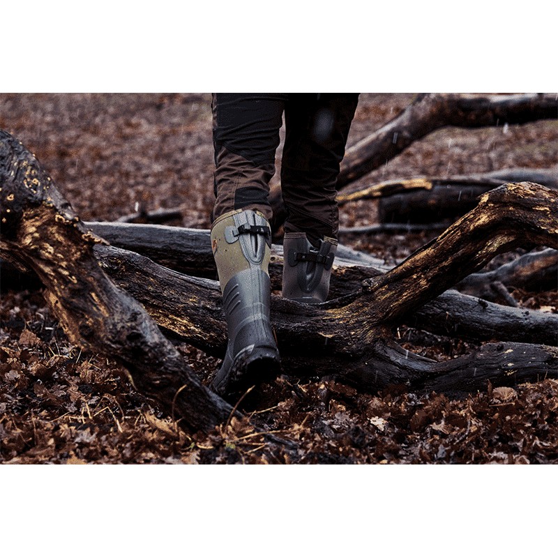 hier is de rubberlaars ideaal voor mensen met stevige benen en brede voeten. ze heeft een verstelbare inzet voor dikkere kuiten. de binnenzool, geïnspireerd op hardloopschoenen, biedt comfort en stabiliteit. de grof geprofileerde buitenzool is zeer slijtvast en biedt uitstekende grip op alle soorten ondergrond.