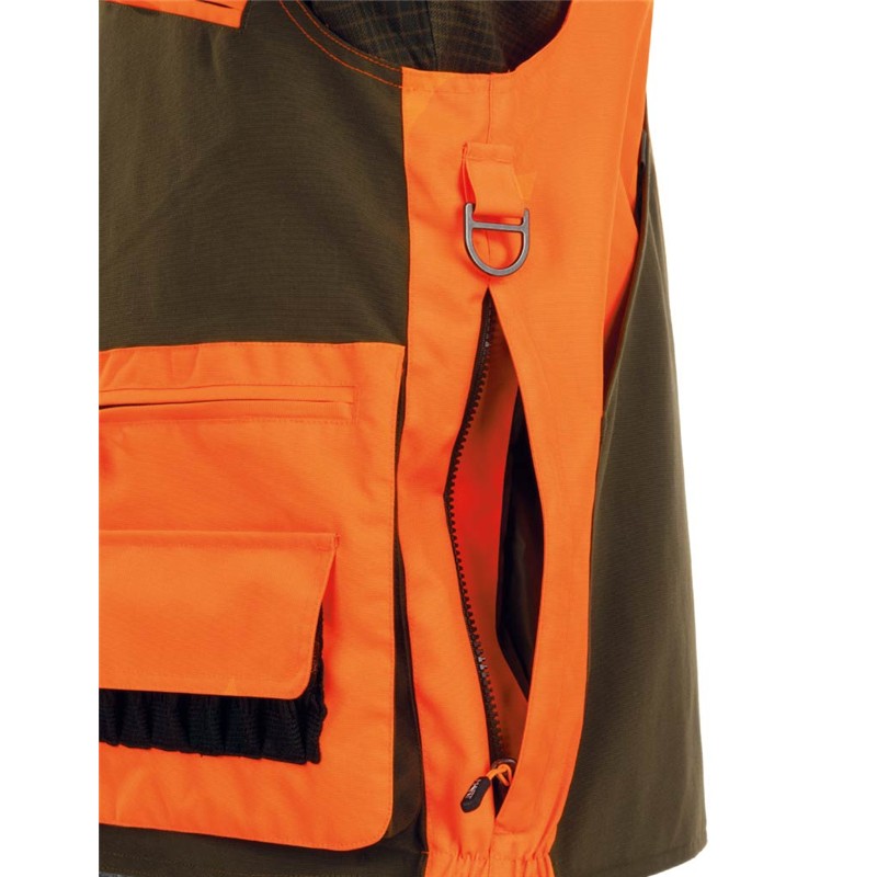 Gemaakt van een stevige maar lichte nylonstof en delen in oranje hoogzichtbaarheidsstof van polyester oxford. Voering van mesh om de ademendheid te bevorderen. Twee rijen paspelwerk en grote cargo-zakken met rits aan de voorkant. 2 met rits afsluitbare borstzakken voor radio/GPS. Metalen ringen aan beide zijden om het wild of accessoires aan op te hangen. Gecertificeerd PBM voor hoge zichtbaarheid.