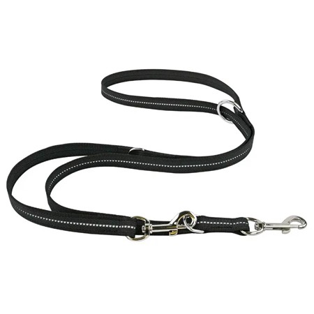 Deze multipositielijn is hét veelzijdige hulpmiddel voor de geleider die zijn aanpak wil aanpassen aan elke situatie op het terrein of tijdens de opvoeding. De constructie in hoogsterkte nylonband bevat een antisliprubberlaag aan beide zijden, wat een stevige en veilige grip garandeert, zelfs bij regen of met handschoenen. Voor extra veiligheid bij nachtelijke verplaatsingen of bij slecht zicht is er een reflecterend draad door de volledige lengte van het product geweven.