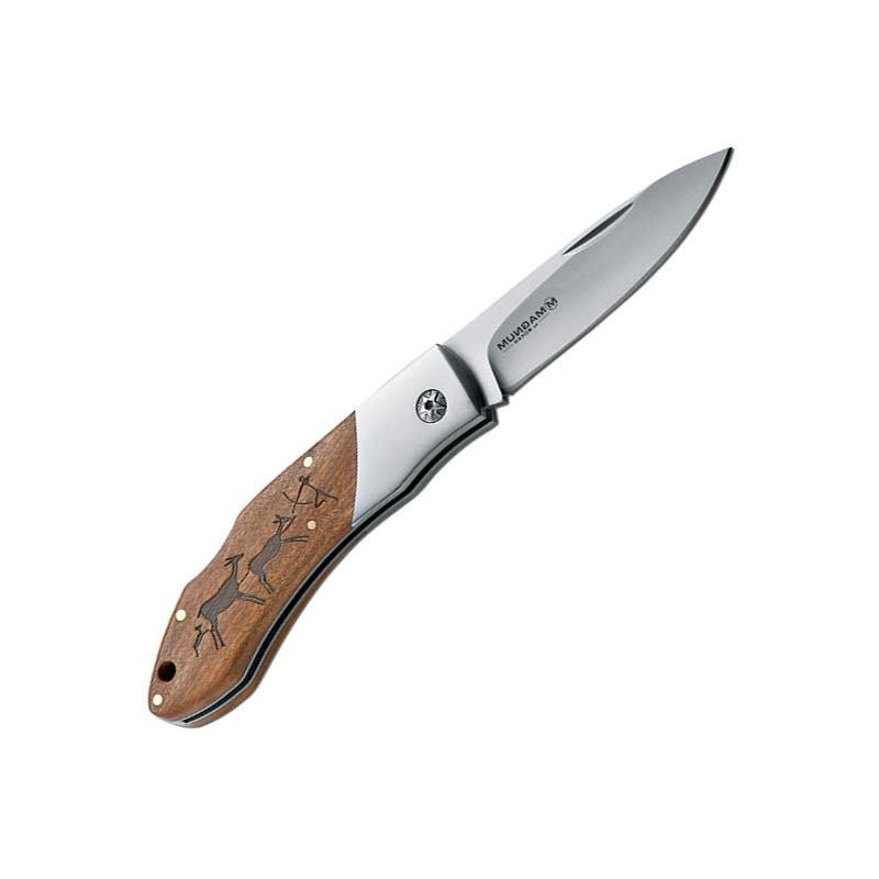 • De gravures op het handvat doen denken aan rotstekeningen die een prehistorische jachtscène uitbeelden.