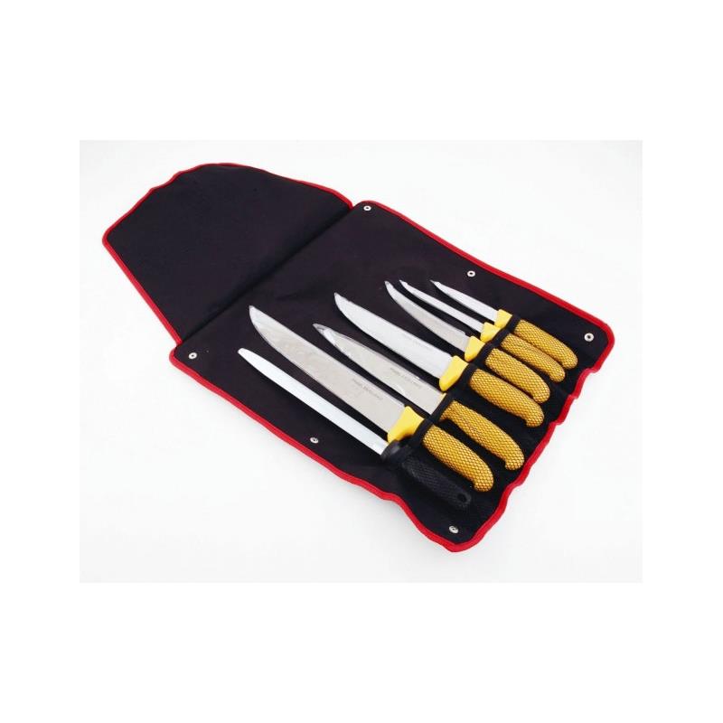Set met 1 aanzetstaal en 6 messen met gele kunststof handvatten en roestvrijstalen lemmetten, met het volgende detail :