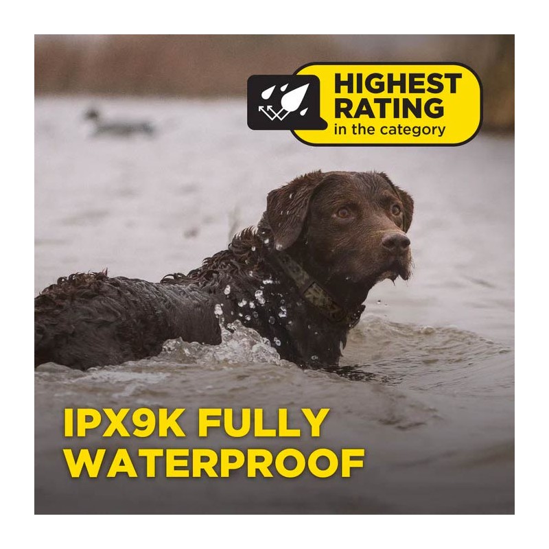 Het robuuste camouflageontwerp valt samen met de omgeving en de volledig waterdichte IPX9K-constructie weerstaat de meest extreme omstandigheden. De beschermende behuizing van de ontvanger vergroot de duurzaamheid, en een LED-licht houdt uw hond zichtbaar bij weinig licht. Of u nu in vochtige gebieden of in het bos bent, de 1200X Camo is geschikt voor alle omgevingen.