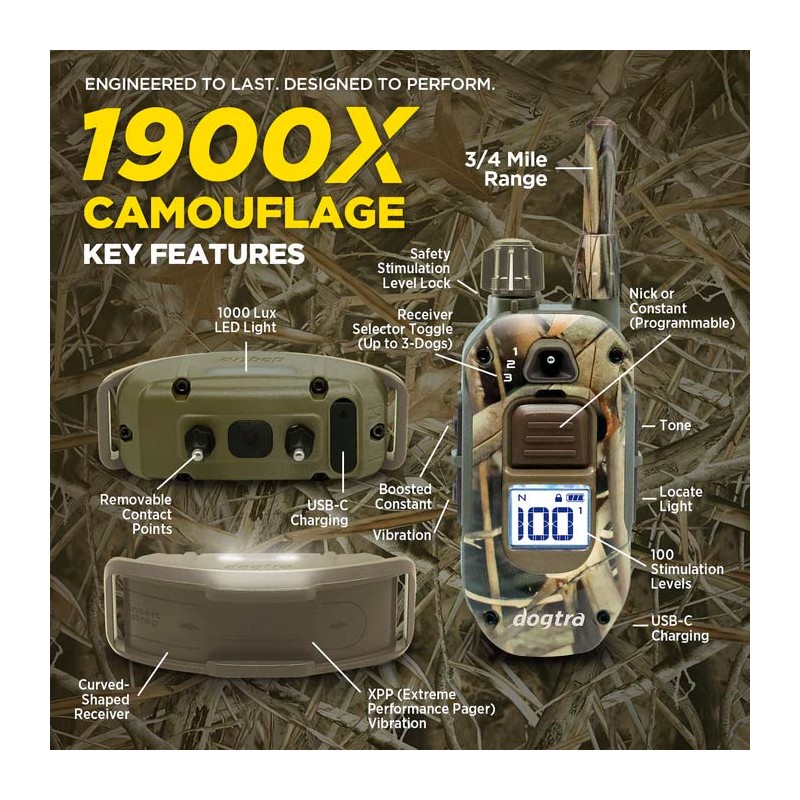 De Dogtra 1200X Camo is ontworpen voor zware jachtomstandigheden en intensieve training. Met een bereik van 1200 m, de BOOST-functie voor snel terugroepen en de XPP-trilling voor een nauwkeurige respons, biedt hij betrouwbare prestaties.