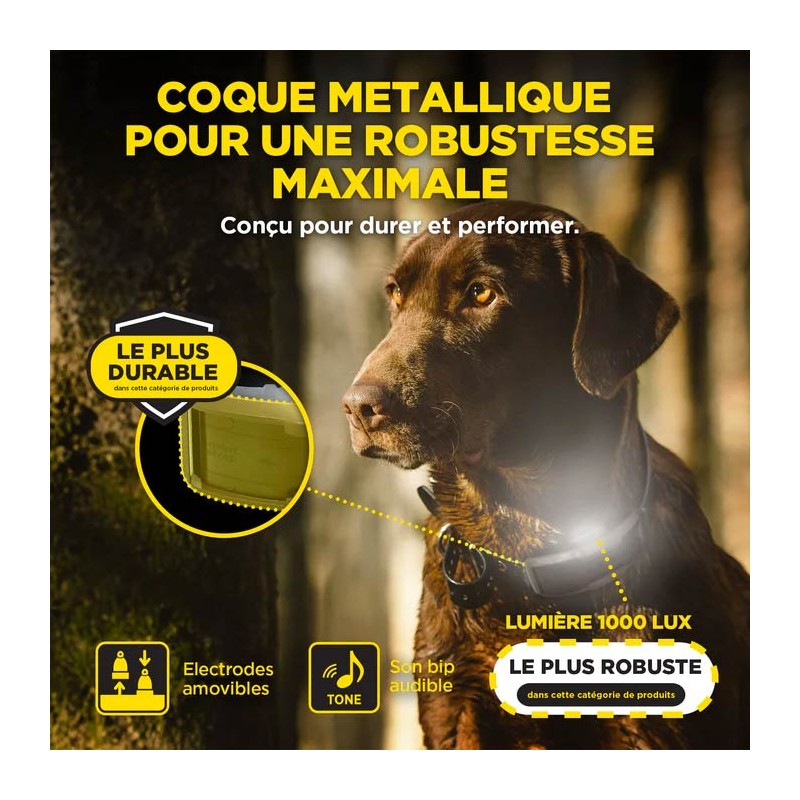 • Li-Po-accu's oplaadbaar in 2 tot 3 uur • Hoorbare toon • Voor honden vanaf 15 kg • Halsband-ontvanger waterdicht IPX9K • Waterdichte zender IPX9K • Zender uitbreidbaar tot 3 honden • Witte LED op de halsband • XPP-vibratie met hoge prestaties, niet-stimulerend • Dubbele beschermbehuizing • Tot 1200 meter • LCD-scherm • Instelbare boost - Continue stimulatie • Vergrendeling van het stimulatieniveau • Rheostatische intensiteitsknop - stimulatieniveaus van 0 tot 100 • Stimulatie van laag naar hoog • Nick- en continue stimulatie