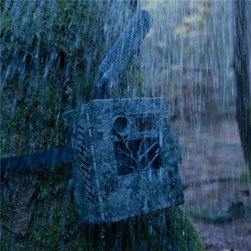 De stevige behuizing omsluit de camera volledig. Nauwkeurige uitsparingen aan de voorkant garanderen dat alle functies van de camera volledig operationeel blijven. Het camouflagepatroon zorgt voor maximale discretie, waardoor de camera bijna onzichtbaar wordt in een natuurlijke omgeving.