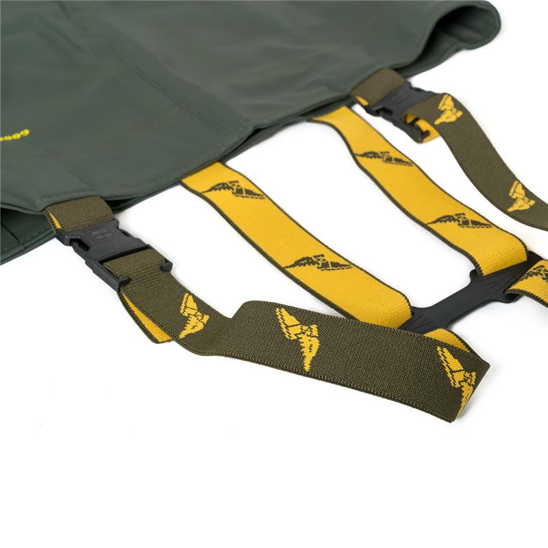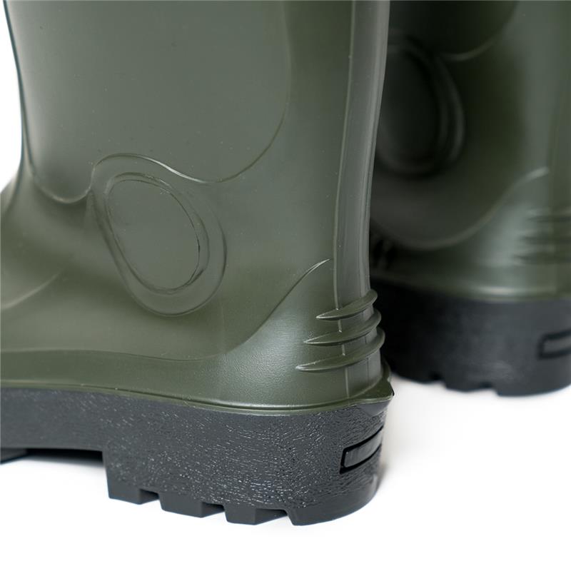 Eigenschappen: • Plavitex: soepele, dunne en duurzame PVC • Ademende katoenen binnenvoering • Elastische bandjes met gespsluiting • Binnenzak in de buikstreek • Naden gemaakt door hoogfrequente las • Antistatische PVC zolen die bestand zijn tegen slijtage en koolwaterstoffen • Gegoten zolen en zelfreinigende noppen • Gewicht: 3,80 kg • Bosgroene kleur - zwarte zool