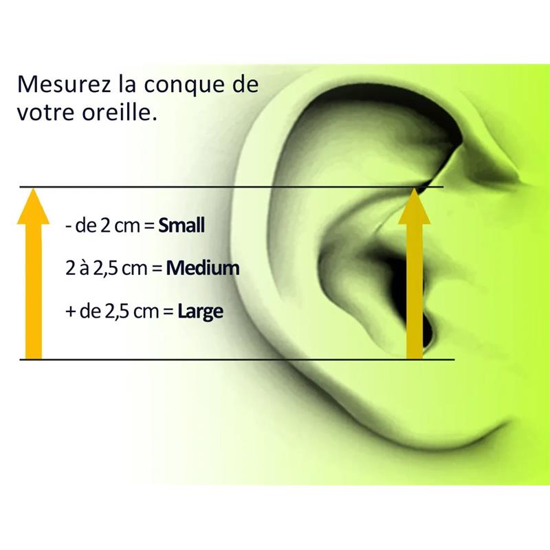 Meet de grootte van uw concha zoals op het schema rechts; het is het holle deel van de oorschelp waar de helix van de oordopjes zal vastklikken.