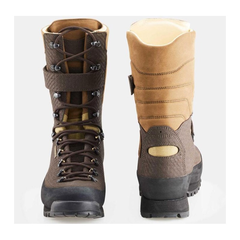 But z odwróconej skóry licowej z cholewką wykonaną z jednego kawałka z pojedynczym nachodzącym zagięciem (patent DIOTTO), które pozwala wodzie i materiałowi drzewnemu spływać, zapobiegając wewnętrznemu zastojowi. Boczne pasy z gumy absorbujące uderzenia zewnętrzne oraz małe elementy zamocowane za pomocą pomarańczowych stalowych bloczków o wysokiej widoczności.