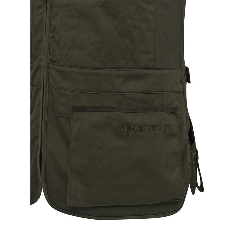 Cechy : • Naramienniki z bawełny, pikowane • Zamek centralny YKK. • Kieszeń kompatybilna z « Beretta Recoil Reducer EVO » (nie w zestawie) • Pojemne przednie kieszenie z fałdą i wzmocnieniami z mikrofibry • Elastyczne wstawki na biodrach • Regulacja talii na zatrzaski • System do zawieszenia słuchawek lub ręcznika po boku • Tylna kieszeń z podwójnym wejściem z wzmocnieniami z mikrofibry • Logo Beretta wyszyte na przedniej kieszeni i na plecach • Krój: prosty