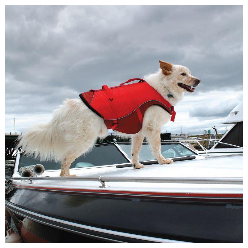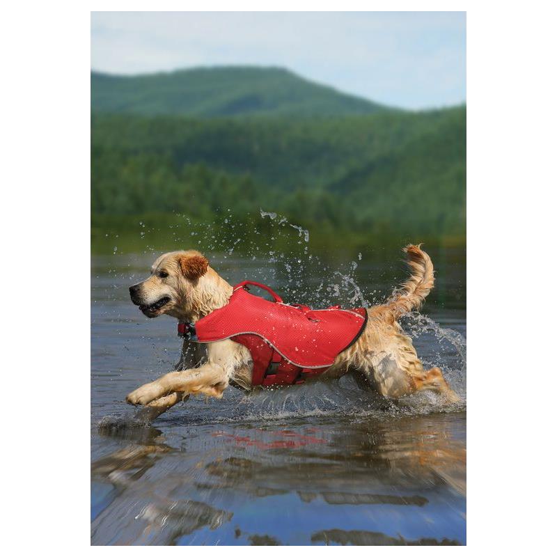 Wykonana z wodoodpornego i wyjątkowo wytrzymałego materiału Ripstop™ 400D, posiada dwie mocne, prostopadłe rączki umożliwiające łatwe wyciągnięcie psa z wody. Kamizelka wyposażona jest w dwa metalowe oczka do przypięcia smyczy; 3 regulowane paski z szybkozłączką pozwalają idealnie dopasować kamizelkę i ułatwiają jej zakładanie oraz zdejmowanie z psa.