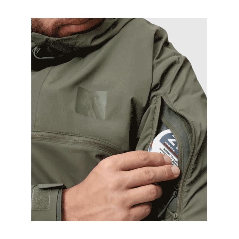 Nakładka na kurtkę, cicha, bardzo lekka, odporna na warunki atmosferyczne i składana, przeznaczona do środowisk zaśnieżonych. Zapewnia kamuflaż i ochronę, jednocześnie umożliwiając łatwy dostęp do sprzętu pod spodem. To ubranie przeciwwiatrowe, lekkie i rozciągliwe we wszystkich 4 kierunkach, posiada panele perforowane laserowo, aby odprowadzać ciepło podczas dynamicznych ruchów w warunkach arktycznych/subarktycznych. Biały kolor używany jest na wierzchu odzieży alpejskiej.