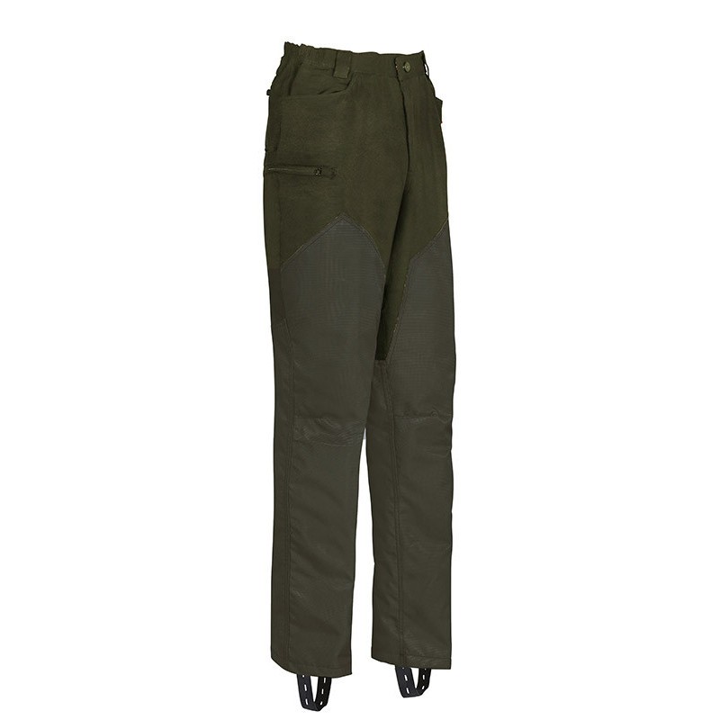 Wzmocnione spodnie myśliwskie.± Górna część elastyczna 97 % poliester, 3 % elastan. z wzmocnieniami z 100 % poliestru, wzmocnionymi i powleczonymi poliuretanem.