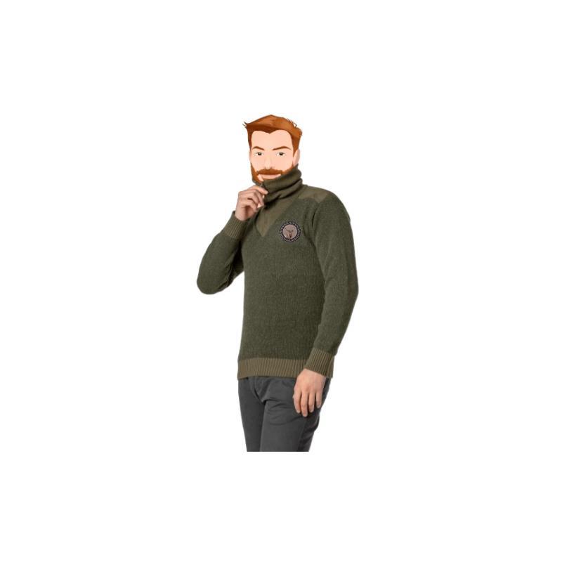 Cechy : • Sweter z dzianiny jersey. • 30% wełna, • grubość 7, grubość wewnętrzna i zewnętrzna. • Kołnierz i ściągacze przy rękawach i w pasie w kolorze kontrastowym, • wstawki z mikrozamszu na ramionach. • Produkt prany i zmiękczony dla miękkiego dotyku. • Sweter myśliwski.