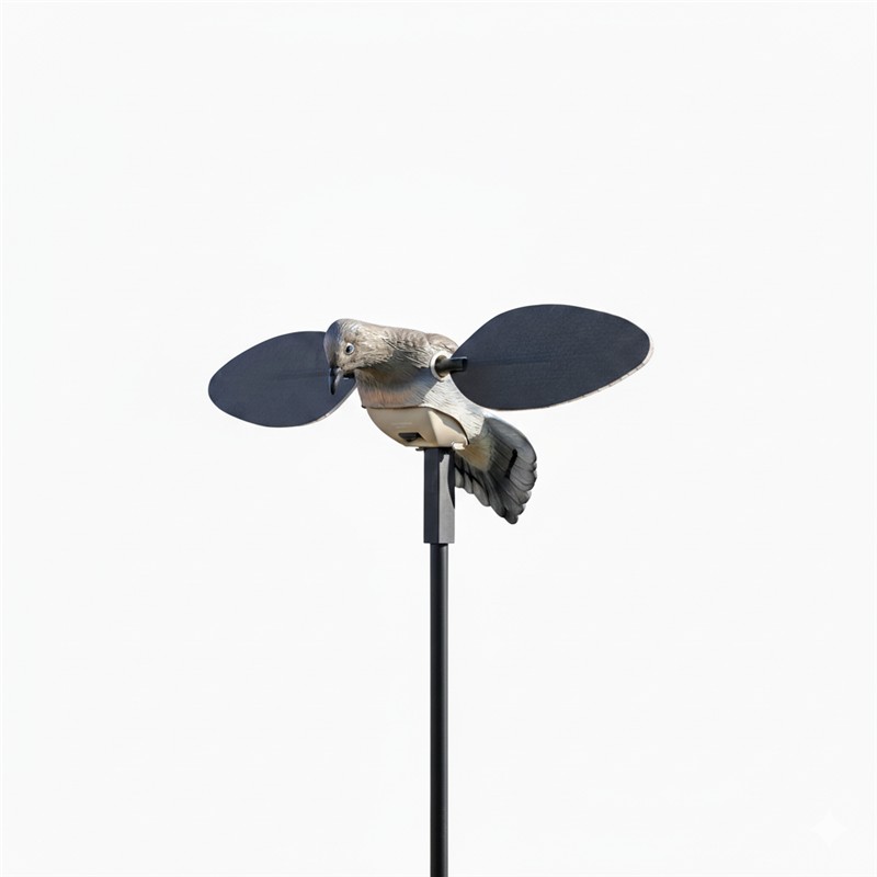 Porada naszych ekspertów : Dla turkawki błysk jest czynnikiem kluczowym. Umieść ten wabik nieco wyżej (na ogrodzeniu, niskiej gałęzi lub na szczycie pręta montażowego), aby zmaksymalizować widoczność poruszających się skrzydeł. Ruch powinien być wyraźnie widoczny z daleka, aby przyciągać przelatujące ptaki. To wabik, który może być skuteczny samodzielnie lub jako uzupełnienie małej linii statycznych form.