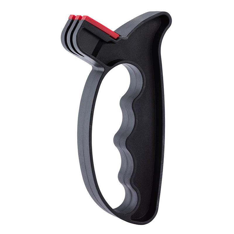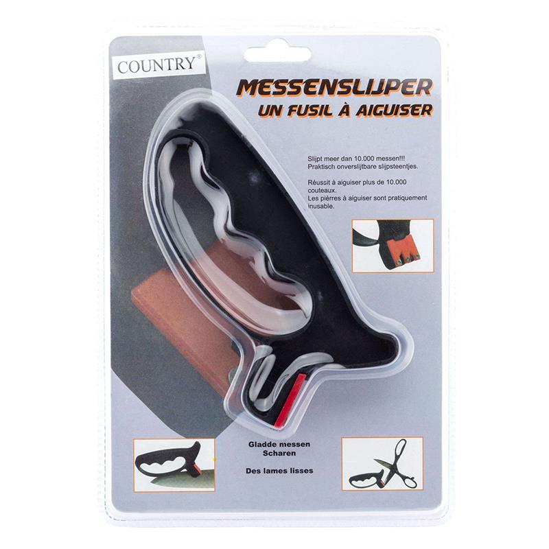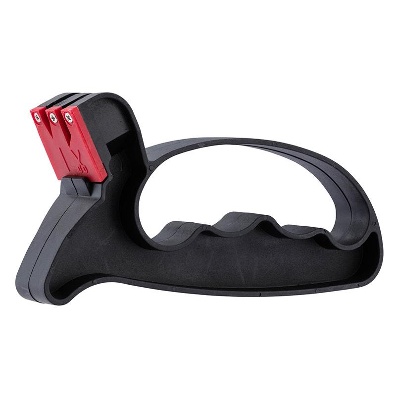 Afiador de carboneto simples e rápido para lâminas lisas. Proteção da mão por uma guarda amplamente dimensionada. A lâmina permanece fixa, é o afiador que se desloca : Posicione a faca ou o par de tesouras aberto com o gume voltado para cima sobre um suporte estável e plano. Coloque o afiador numa extremidade da lâmina e faça movimentos de vai e vem.
