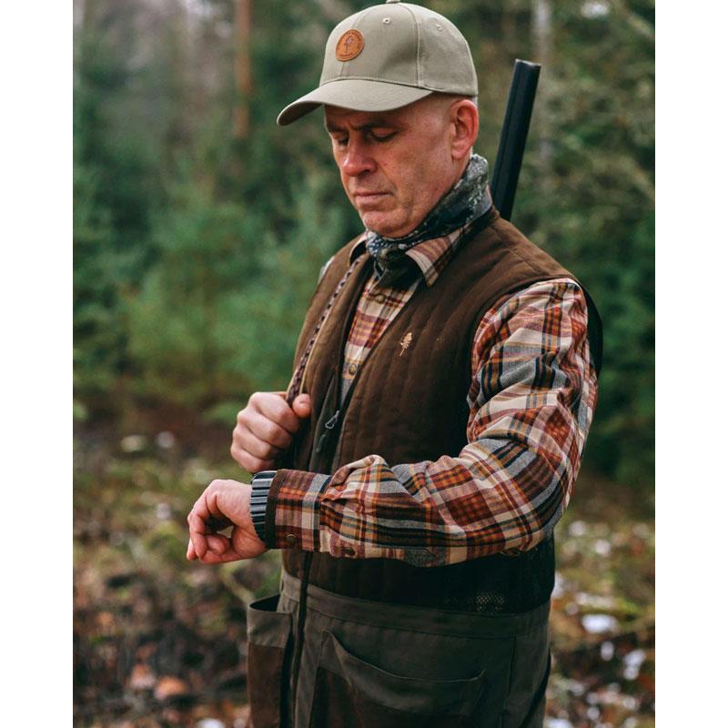 Camisa exclusiva em flanela resistente, com cores vibrantes. Fecho com botões de pressão. Bolsos de peito com aba e um bolso de segurança com fecho éclair. Detalhes em imitação de camurça conferem um toque exclusivo. Ideal para caça e atividades ao ar livre.