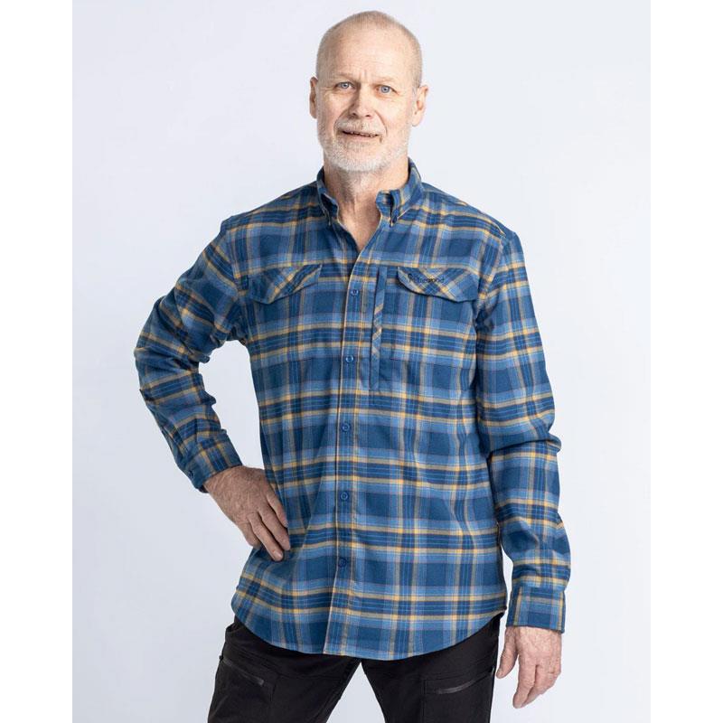 Uma camisa para homem suave e elástica com bolsos inteligentes e propriedades de material que a tornam perfeita para caminhadas.