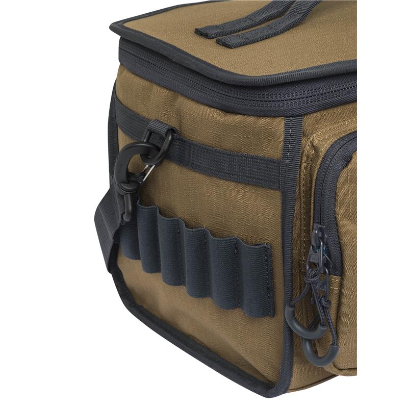 Saco para cartuchos que comporta até 6 caixas de 25 cartuchos, com 3 bolsos externos para chokes, tampões e outros acessórios.