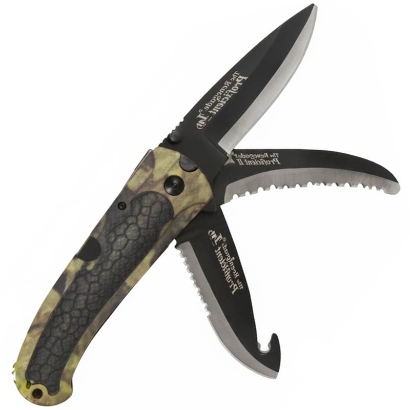 Faca dobrável de 3 lâminas com estampa camo laranja no cabo ergonômico. Empunhadura reforçada. Aço 420 carbono/cromo. Lâmina de 9±cm. Trava de segurança. Entregue em blister. Ghost camo B&B - Ghost camo Forest