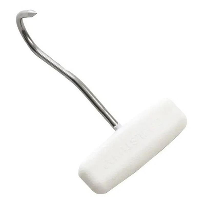Gancho em inox para agarrar carcaças com cabo em plástico moldado. O cabo deste gancho de carcaça é adaptado para grandes mãos para facilitar a sua preensão. Comprimento de 16,5 cm, fio inox de 7 mm de diâmetro. Fabrico europeu.