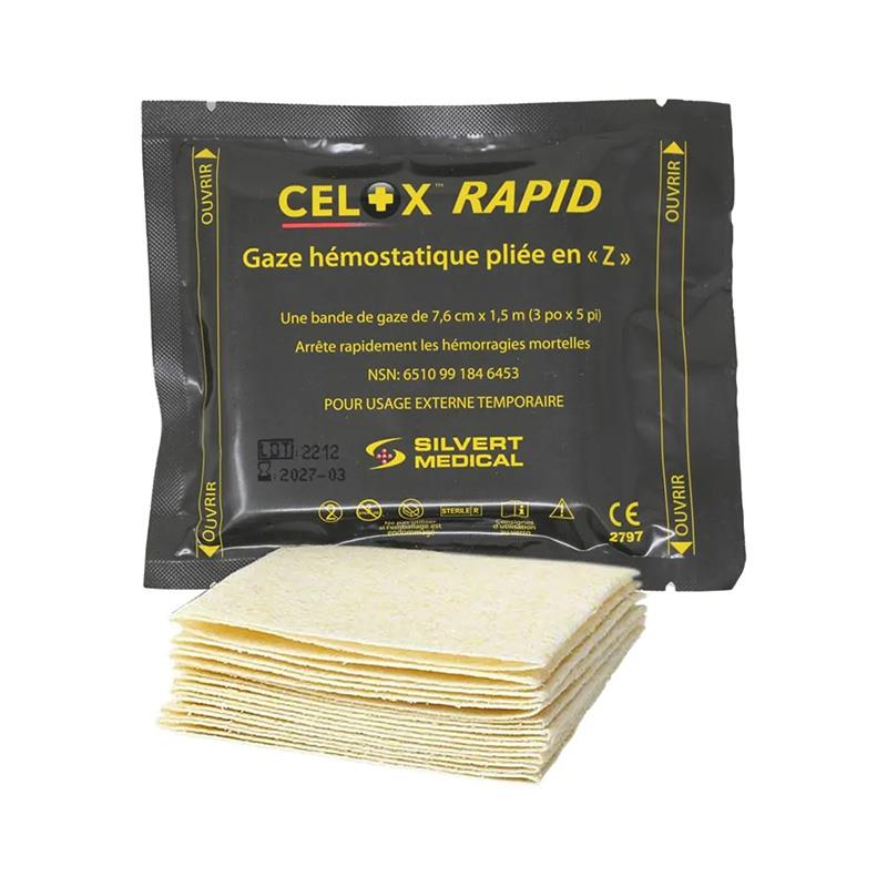 A geração atual de agentes hemostáticos requer pelo menos 3 minutos de compressão para funcionar. A gaze Celox RAPID elimina esse tempo, acelerando o tempo de embalagem e reduzindo o tempo de compressão para apenas 60 segundos, usando a tecnologia comprovada dos hemostáticos Celox. O tempo é um fator crítico quando se trata de tratar ferimentos graves no campo e economizar tempo aumenta as chances de sobrevivência da vítima em situações de emergência ou hostis. Para serem eficazes na utilização real, os curativos hemostáticos devem agir rapidamente. Referência conforme CE Francês.