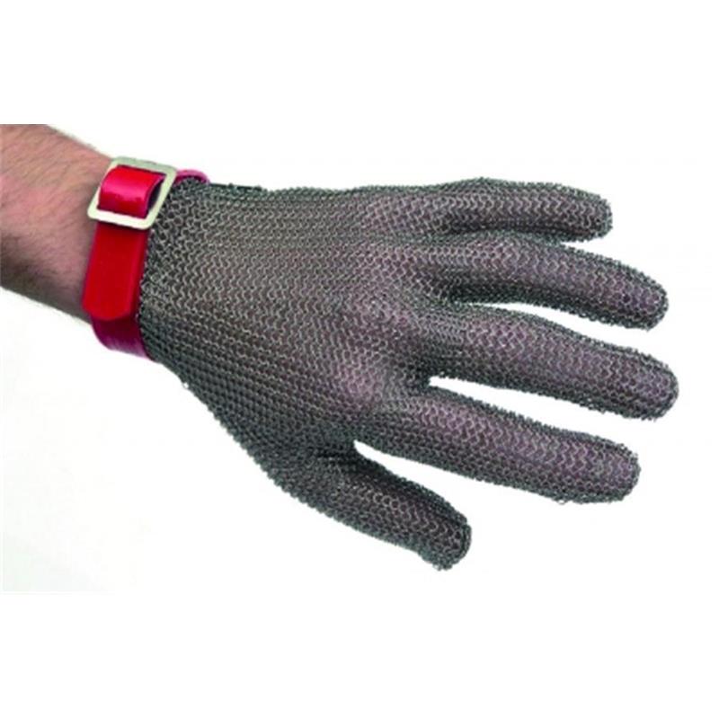 Luva em malha de inox, muito flexível, tamanho 10 (XL), ou seja, 27 cm de circunferência da mão, com tira de aperto. Protege a tua mão de cortes quando cortas carne, desossas um presunto ou um pernil ou afias a tua faca com uma chaira. Luva reversível (mão esquerda ou mão direita). Mede a circunferência da mão com uma fita métrica sem apertar.