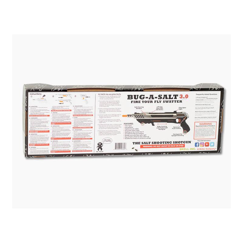 Este modelo elegante, cinza canhão metálico, está equipado com uma mira de fibra óptica para melhor precisão contra insetos nocivos. Este modelo funciona bem em todas as condições, mas é ideal (as fibras ópticas filtram a luz ambiente) para garagens pouco iluminadas ou safáris ao pôr do sol no quintal. Além disso, o ADVANCED COMBAT BUG-A-SALT 3.0 possui todas as funcionalidades como disparo rápido, segurança com pino cruzado, e chances consideravelmente aumentadas de abater em pleno voo. Desperte o SOLDADO RYAN que há em você, recrute seu ESQUADRÃO, faça saltar as escotilhas da ponte do rio Kwai e não deixe nenhuma mosca viva!