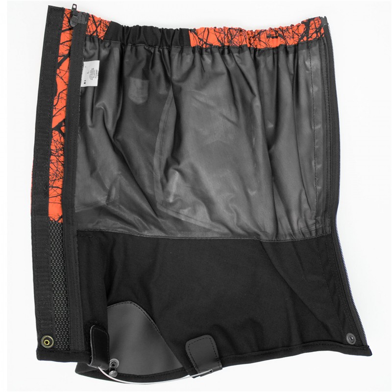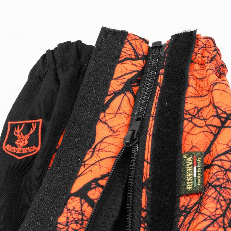 Nova polaina ergonómica em nylon laranja fluorescente com efeito de ramos e reforçada com putek, equipada com: