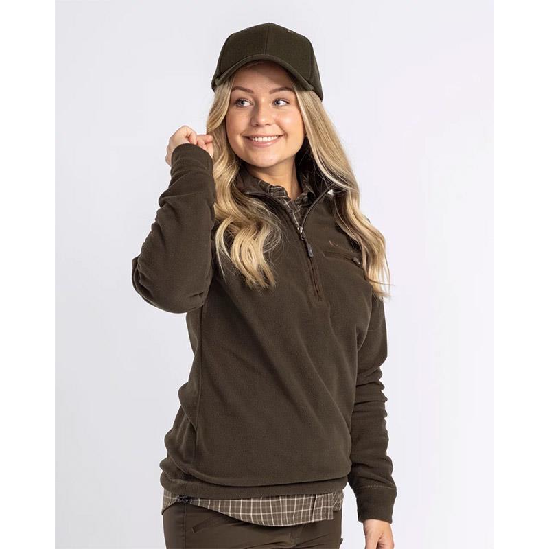 O polar Half Zip da Småland Hunter é um fino polar de poliéster reciclado que funciona muito bem como camada intermédia. A parte de baixo é ajustável com um cordão de aperto e o bolso no peito tem um fecho de correr para arrumação segura. O polar tem bonitos detalhes em pele sintética à volta do fecho e do bolso, assim como nos ombros e na gola. Graças ao meio fecho, podes abri-lo quando precisas de ventilação ou fechá-lo completamente em tempo mais frio.