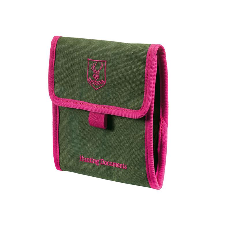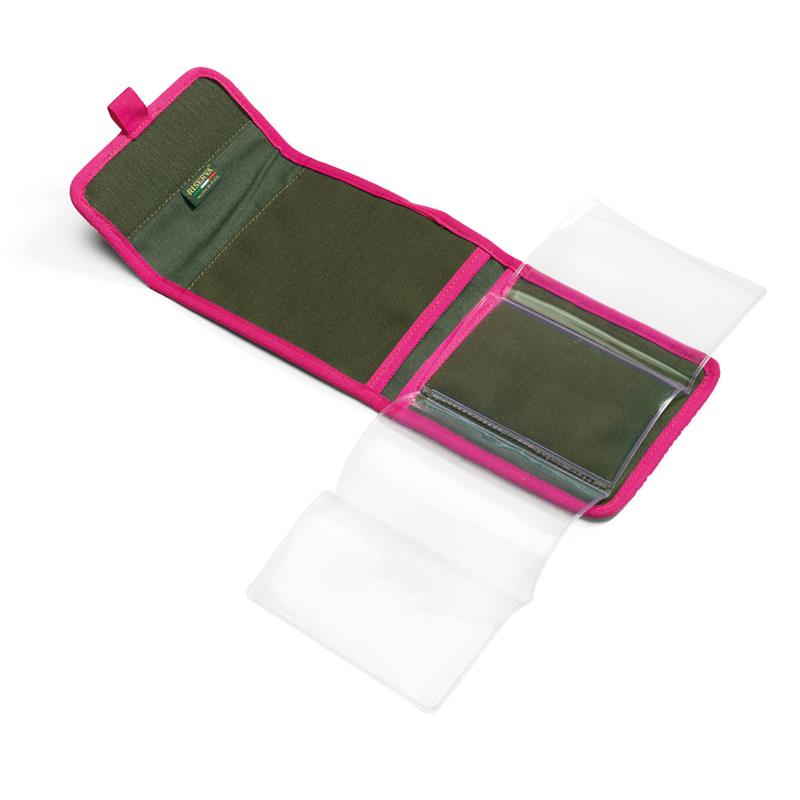 Porte permis en coton léger avec détails magenta, avec compartiments en plastique pour les documents.